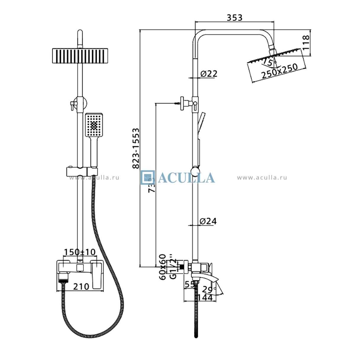 • Современный душевой гарнитур со смесителем и изливом для ванны