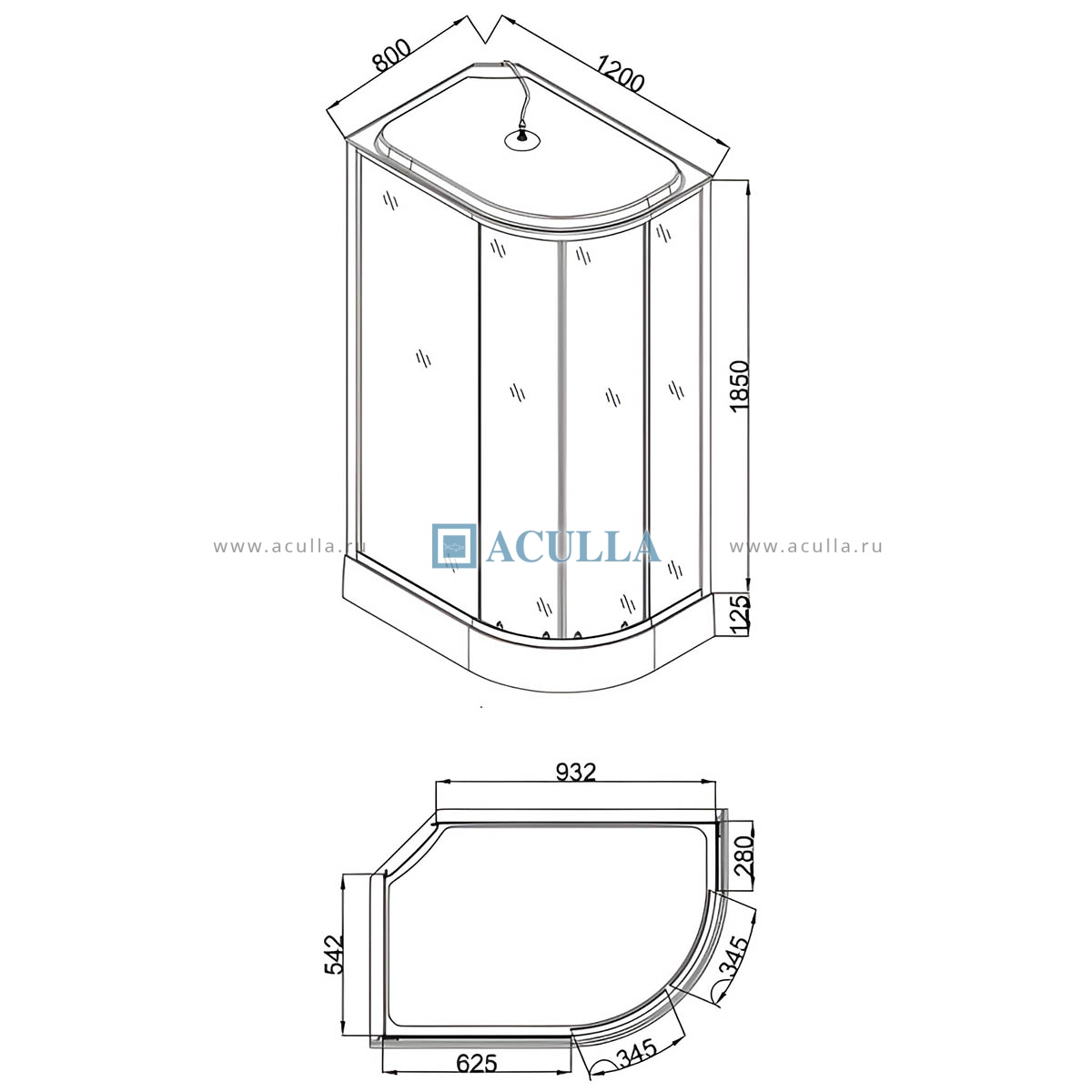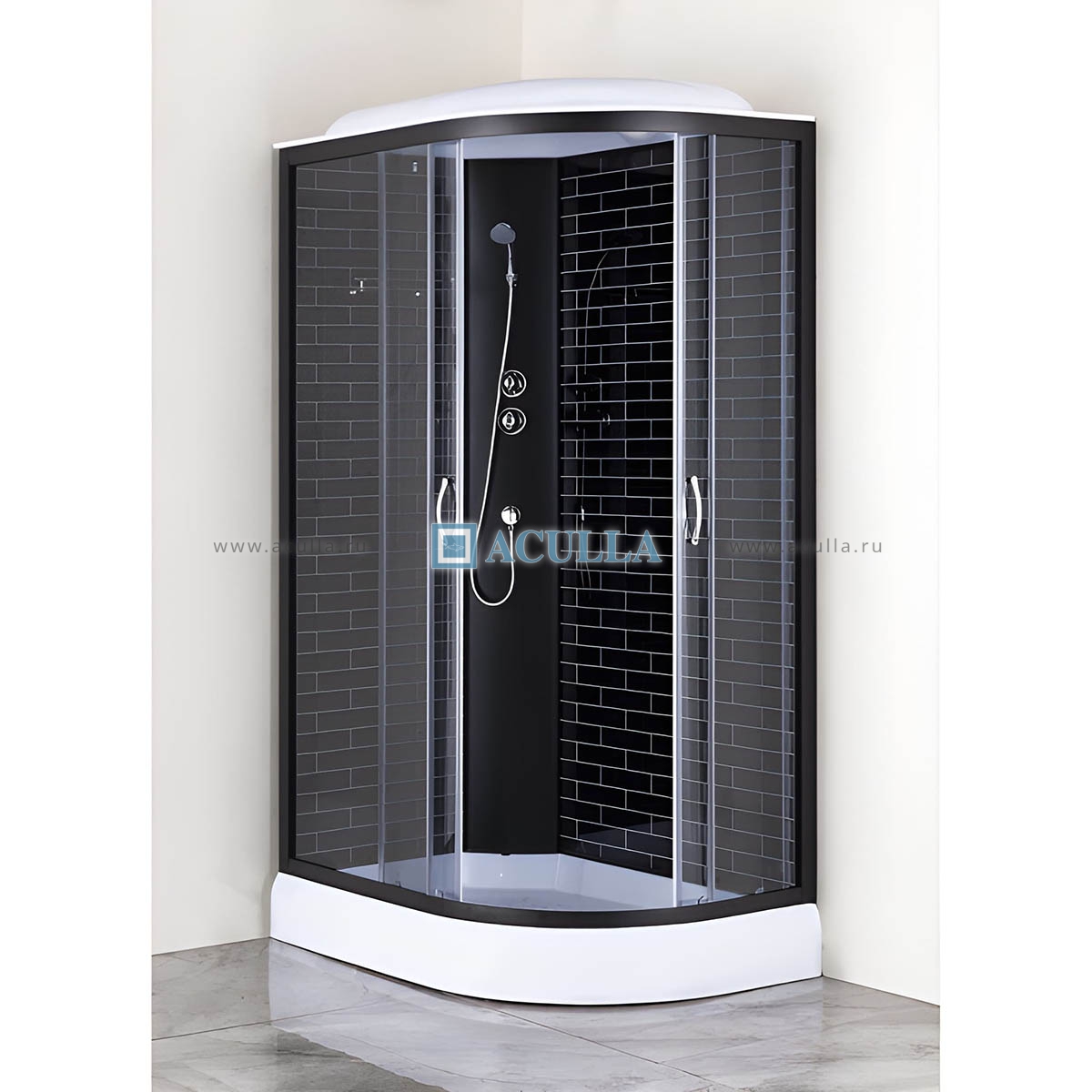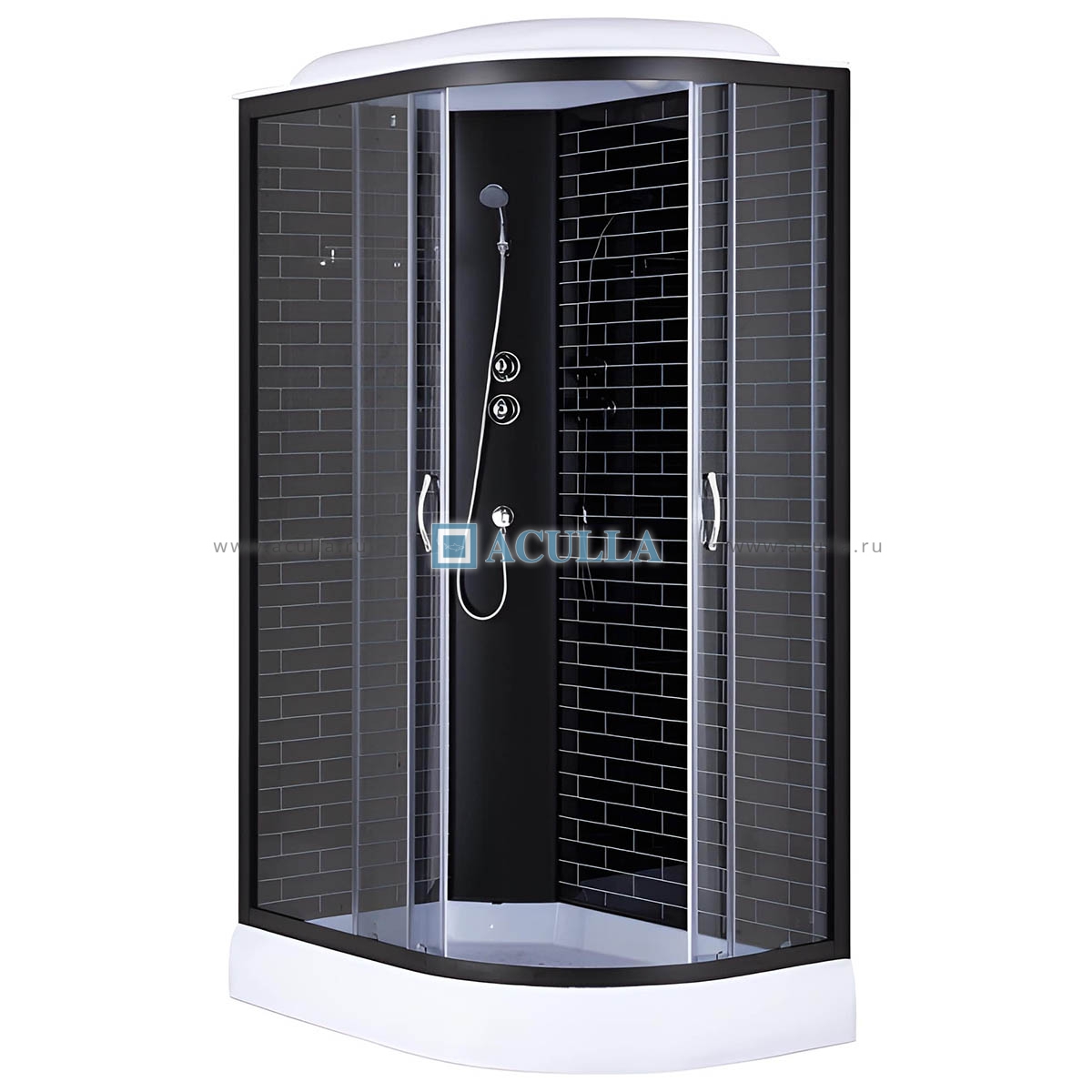• Чёрно-белая ассиметричная душевая кабина с размерами: 120х80х215 см