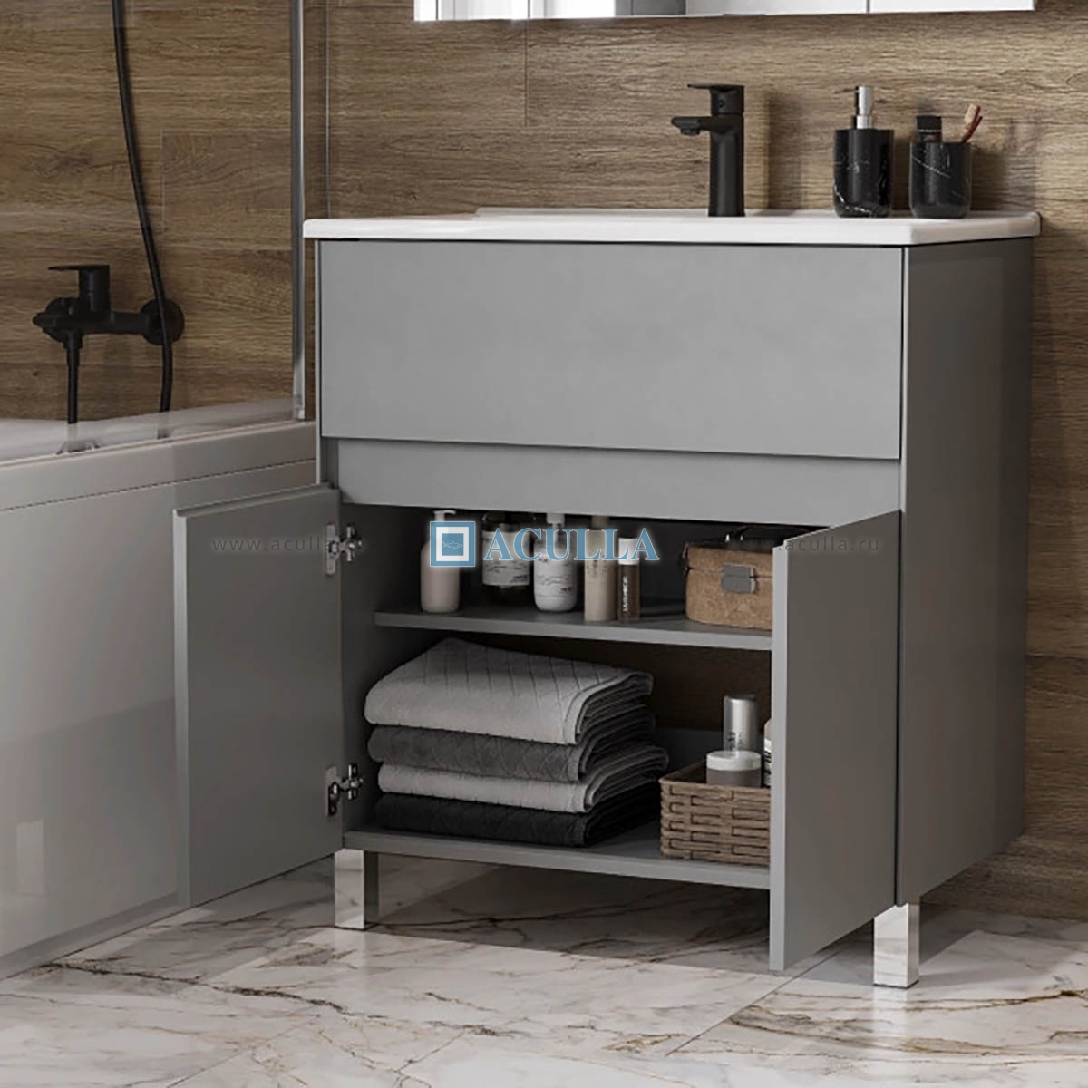 • Минималистичный сдержанный дизайн позволяет органично вписать ее в большинство современных интерьеров • В тумбе максимально удобная эргономика: функциональный ящик и вместительно пространство за фасадами-створками • Верхняя часть фасада-створки обработана под ручку L-профиль, за створками скрываются две полочки, одна из которых регулируемая, а также немного утоплена внутрь для комфортного хранения высоких предметов • Тумбы коллекции Форест могут устанавливаться как на опоры, так и в подвесном варианте: в комплект входят две регулируемые опоры • Цвет: туманный серый • Тумба комплектуется умывальником Santek Элина 75 см • Поставляется в собранном виде. Тумба с умывальником Акватон Форест 75 1A2783K0FR4D0 75 смКод товара: 1093000897