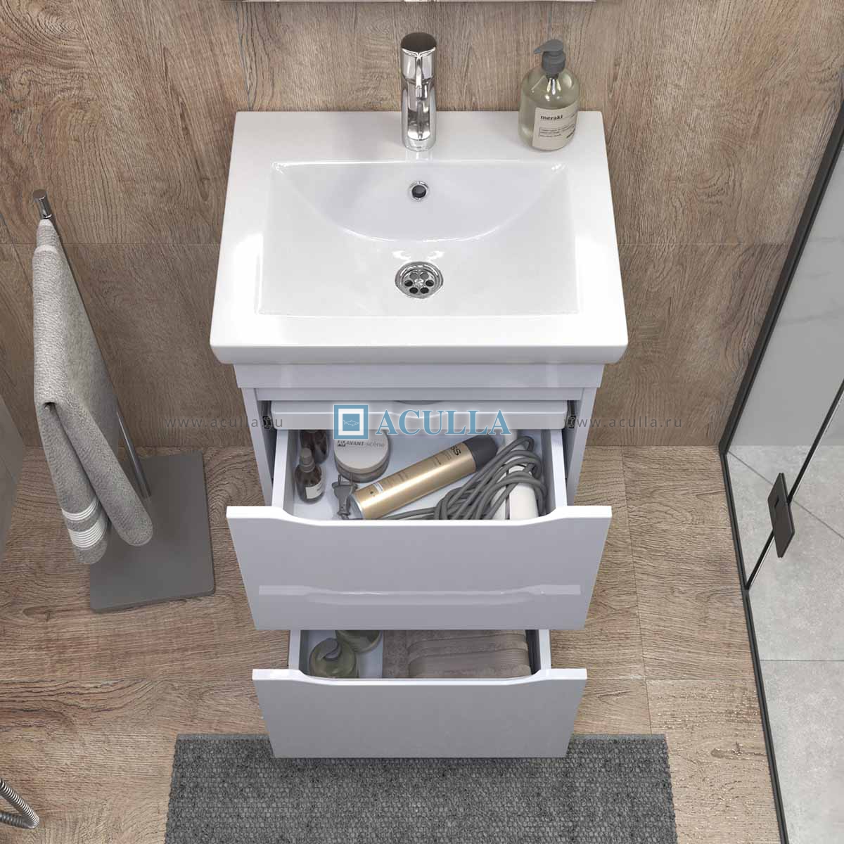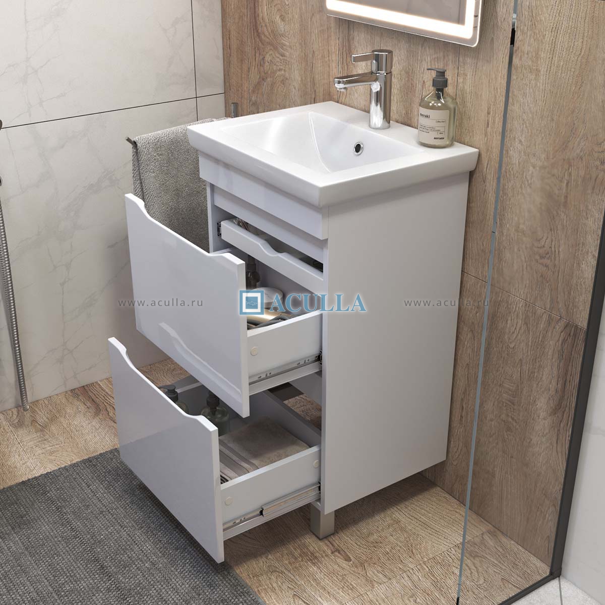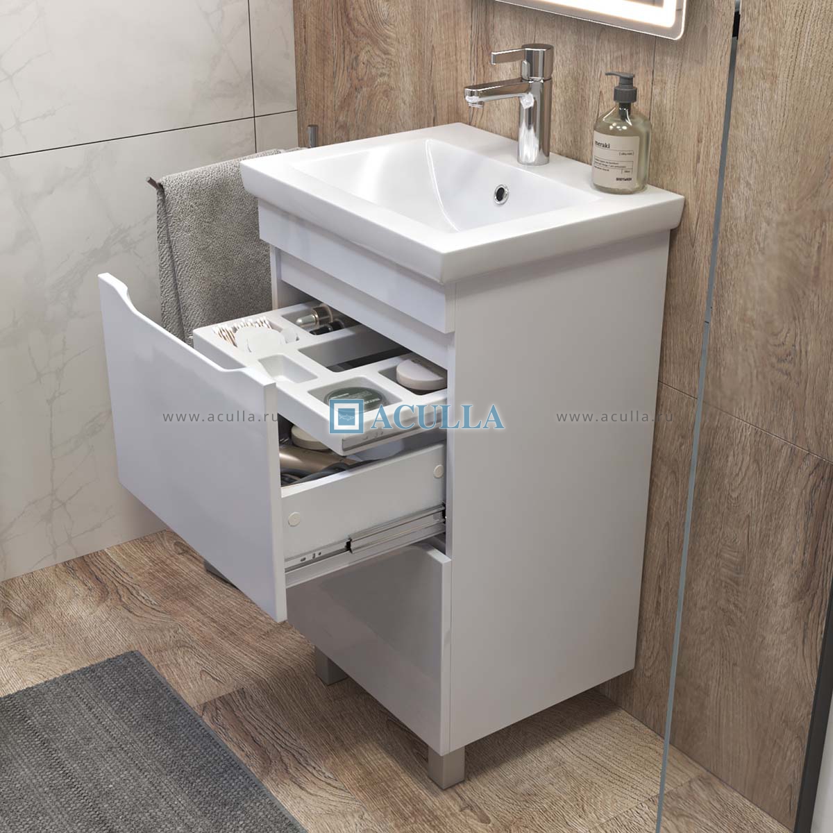 • Тумбы из коллекции Vigo Grani оснащены удобным органайзером, который позволяет легко находить и доставать необходимые вещи