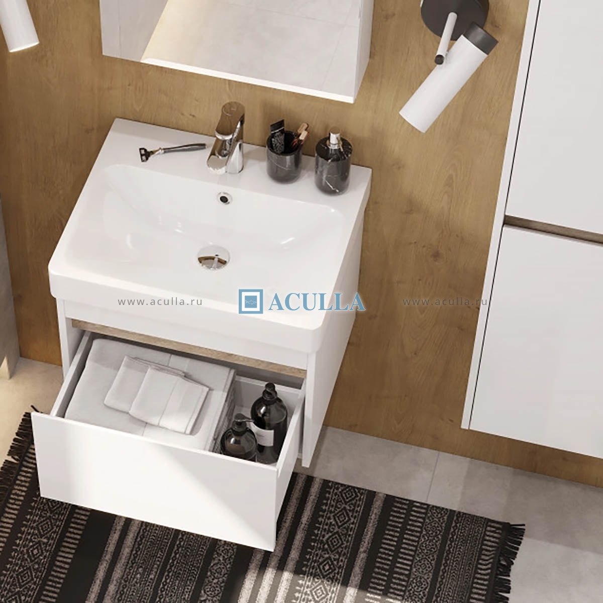 • При этом тумба Марти смотрится интересно благодаря выпилу на фасаде, который позволяет открывать тумбу за фасад: в углублении видна контрастная вставка в древесной отделке • Эта акцентная деталь придает модели графичность и позволяет подчеркнуть правильные пропорции тумбы • Корпус и боковые стенки изготовлены из влагостойкой ламинированной ДСП, окрашенной в белый цвет специальной краской ультрафиолетового отверждения для защиты мебели от влаги в условиях ванной комнаты • Декоративная вставка в цвете дуб эндгрейн • Тумба комплектуется умывальником Santek Адриана 55 см • Поставляется в собранном виде. Тумба с умывальником Акватон Марти 55 1A2632K0MY010 55 смКод товара: 1094001016