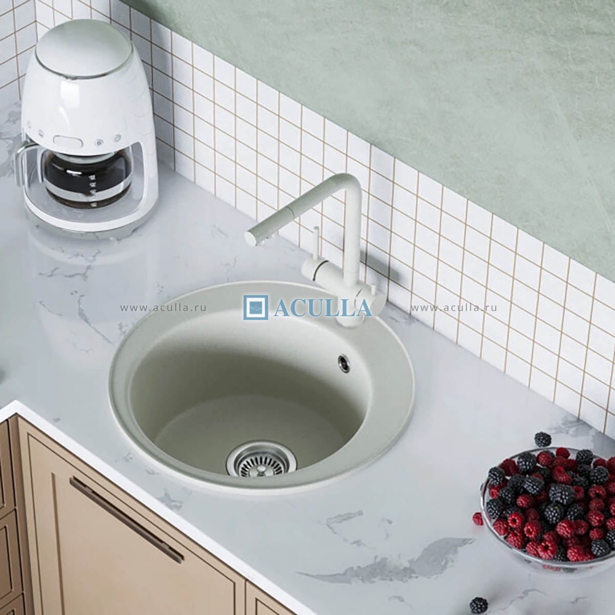 • Классическая кухонная мойка Акватон Шелли изготовлена из литого мрамора круглой формы с едва заметным бортиком, защищающим от разлива воды