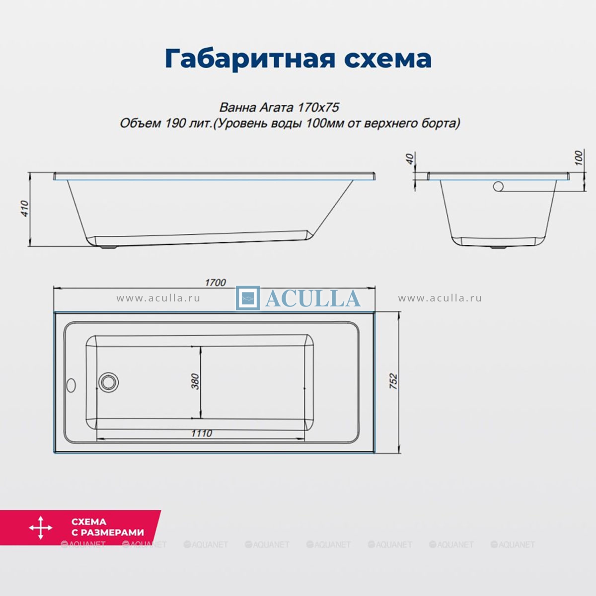 • Прямоугольная ванна Aquanet Agata 170 см имеет глянцевую белоснежную поверхность, устойчивую к появлению внешних дефектов